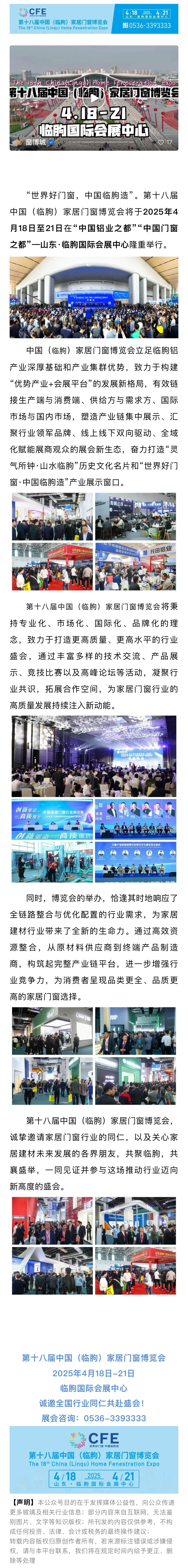 【行業(yè)資訊】第十八屆中國(臨朐)家居門窗博覽會將于4月18日至21日,在臨朐國際會展中心隆重舉行!